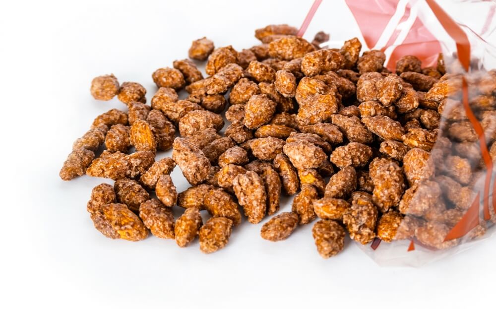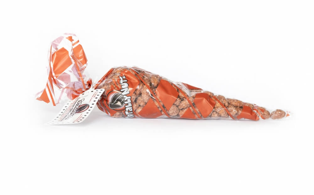 8 oz. of our fresh cinnamon glazed almonds in a poly cone bag.